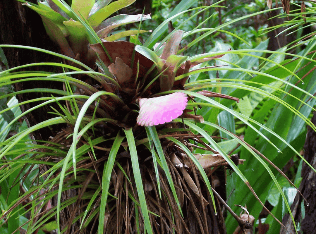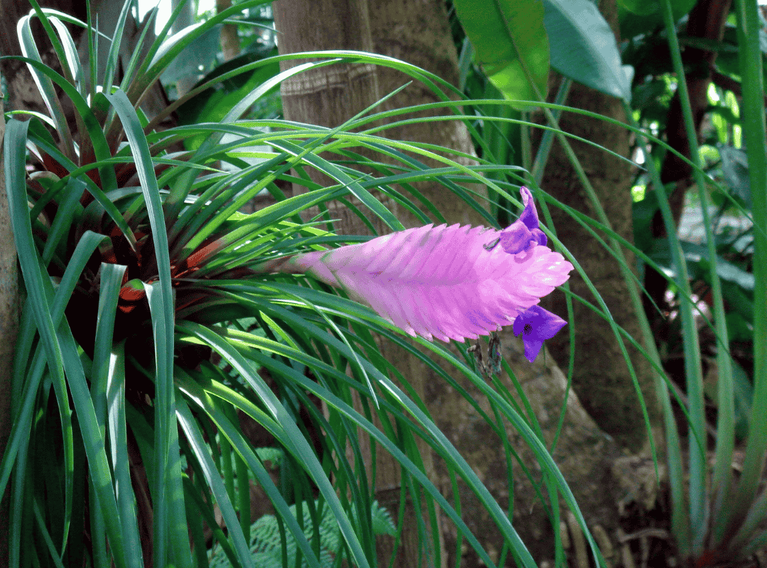 蓝铁兰(Tillandsia cyanea)是最受欢迎的铁兰品种之一,因其深粉色的“火烈鸟舌头”状花簇而闻名。紫色或蓝紫色的花朵位于粉色苞片之间。这种植物可以盆栽或悬挂种植。喜弱光、中等湿度,避免浇水过多。